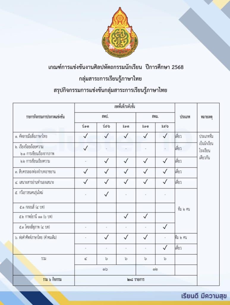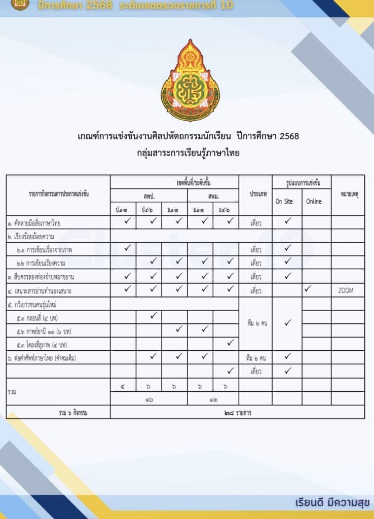 เริ่มแล้ว เกณฑ์การแข่งขันงานศิลปหัตถกรรมนักเรียน ปีการศึกษา 2568 เฉพาะเขตตรวจราชการที่ 10 (เขตตรวจอื่นๆ รอติดตามจ้า)